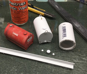 The models start out as 1/2 inch PVC pipe from a hardware store. I bought the 2 inch pre-sized for about 60 cents each. I used Plastruct orange label solvent to attach end caps of .040 styrene. After the solvent has dried, I use a nail file sanding stick to shape the ends to match the pipe. Some styrene angle stock forms the base. A paper punch firms nice perfectly round bits of styrene to represent drain plugs and fill caps. I have several sizes of these common hole punches. Lifting brackets are formed from .015 styrene and a vent pipe is made from a piece of .030 brass rod. Signs and labels are printed on photo paper. A little weathering finishes the simple red paint job.