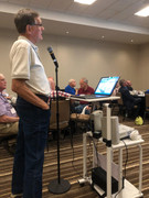 The banquet was not shown in Dan and Amy's convention coverage. Some folks in the photo below had to decide whether to watch all of David's presentation or turn around occasionally to finish their cheesecake desserts.