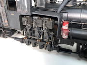 that large piece of pipe (silver duct) on the left side running board is used to discharge the cinders from the smoke stack, which is a story in itself.  The locomotive arrived with a straight stack, however to reduce fires they ordered a Radley Hunter design stack from Lima.  In the process of ordering a couple numbers got switched around, and instead of a stack sized for a narrow gauge shay they got a stack for a large standard gauge shay, but they made it work out and the oversized balloon stack is a signature feature of this shay.  Anyways, the Radley Hunter design uses vanes in the stack to throw cinders out of the smoke and they are collected in the outer part of the stack.  To drain the cinders the crew place that large silver duct under one of the discharge ports (one on each side) and removes the cap.  The duct directs the cinders out to the sides of the track.