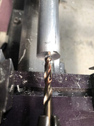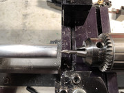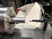 After taking a skim cut on the end of the rod, the next step was to locate the center of the material for a 1/4" hole to mate with the Pittman gear motor. This is done with a "center drill."