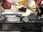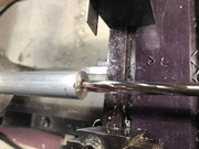 So I turned an aluminum roller assembly on the lathe, drilled through for a central brass axle shaft and ball bearing pockets on each end. Here we see one end of the roller being precision bored. The outer race of the bearing just barely fit.