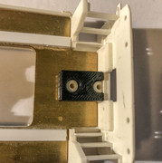 In a later modification of the motor mount I added a second pair of prongs that clip to the edge of the walkway. Because these were printed as an overhang, they all need light filing to proper height. What you can't see is the third fuel tank screw hole under the motor, which has been countersunk for a flathead screw. I plan to see if I can heat Cerrobend to just past melting and use it to fill the lower half of the fuel tank without warping the styrene.